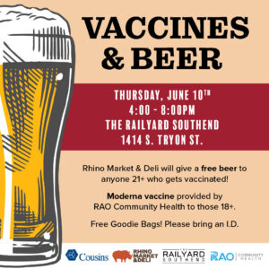 Come out after work to The RailYard Southend to receive your COVID-19 vaccine! RAO Community Health will be offering Moderna vaccines to those 18+ and Rhino Market & Deli will be giving a FREE beer to anyone 21+ who gets vaccinated! Bring a friend, get vaccinated, and grab a drink! Please bring your photo I.D. Walk-ups are welcome, but pre-registration is recommended. Pre-register here: https://www.surveymonkey.com/r/8QRW32G